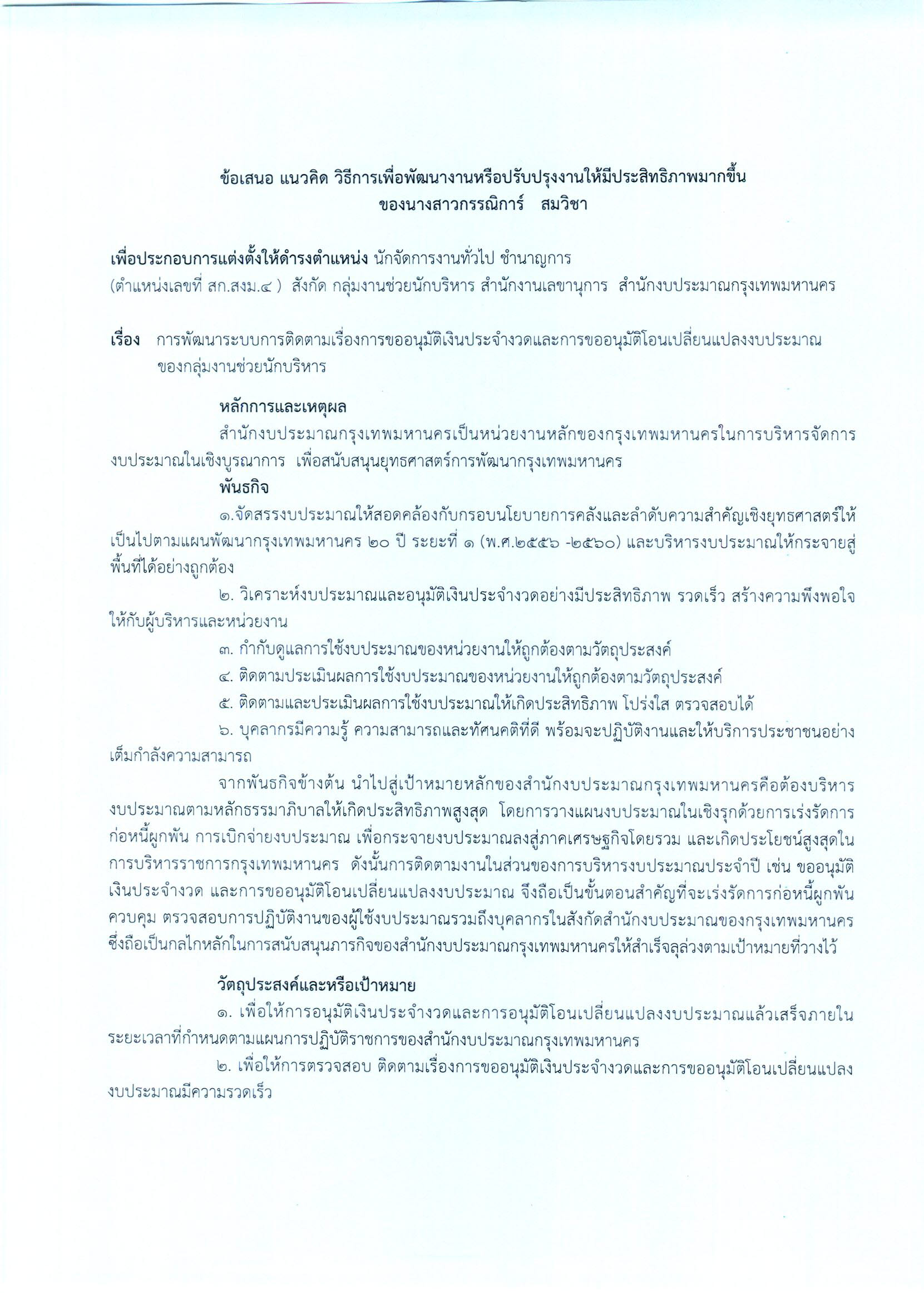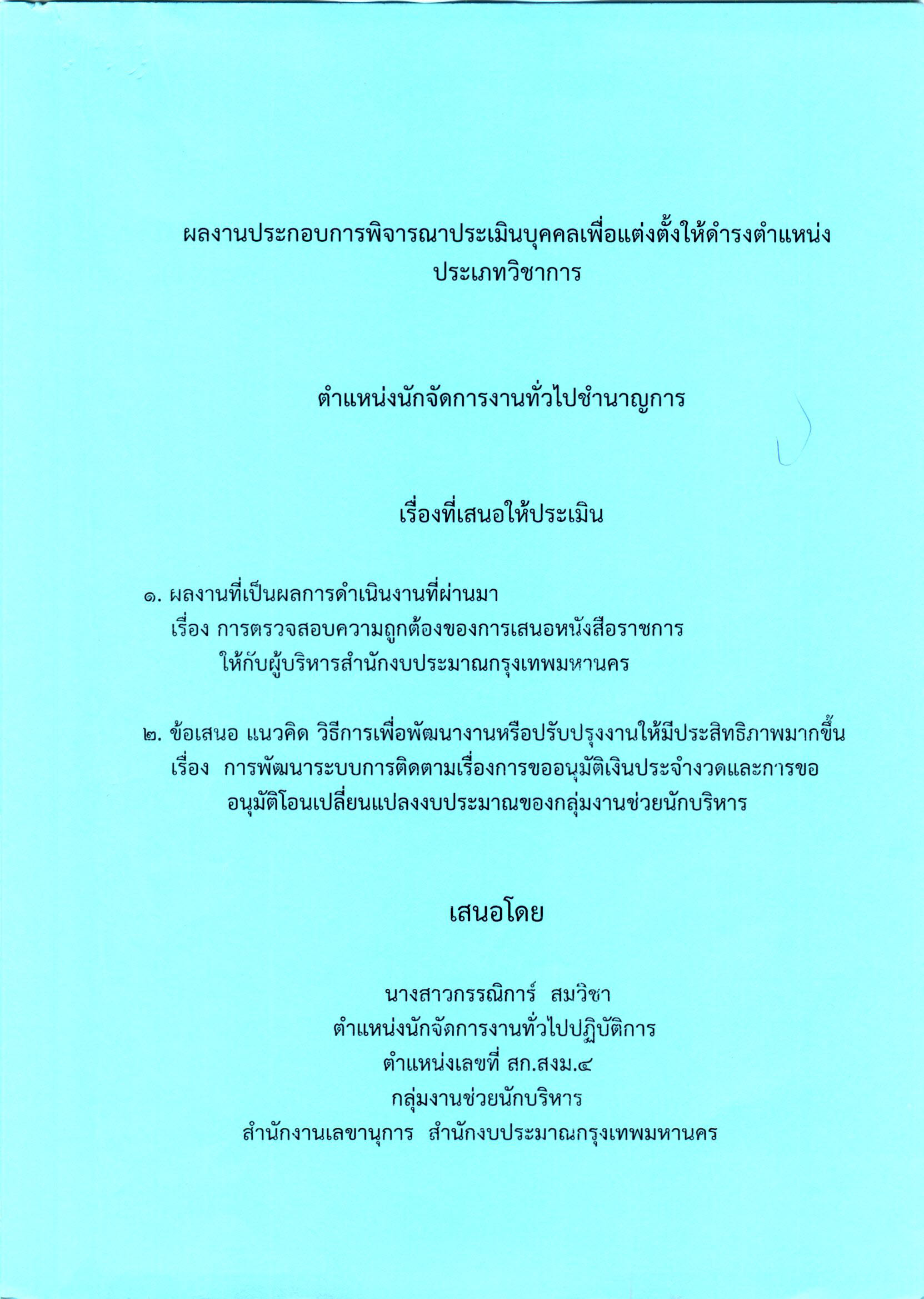 ผลงานการประเมินบุคคลเพื่อแต่งตั้งให้ดำรงตำแหน่งประเภทวิชาการ ตำแหน่งนักจัดการงานทั่วไปชำนาญการ นางสาวกรรณิการ์ สมวิชา
