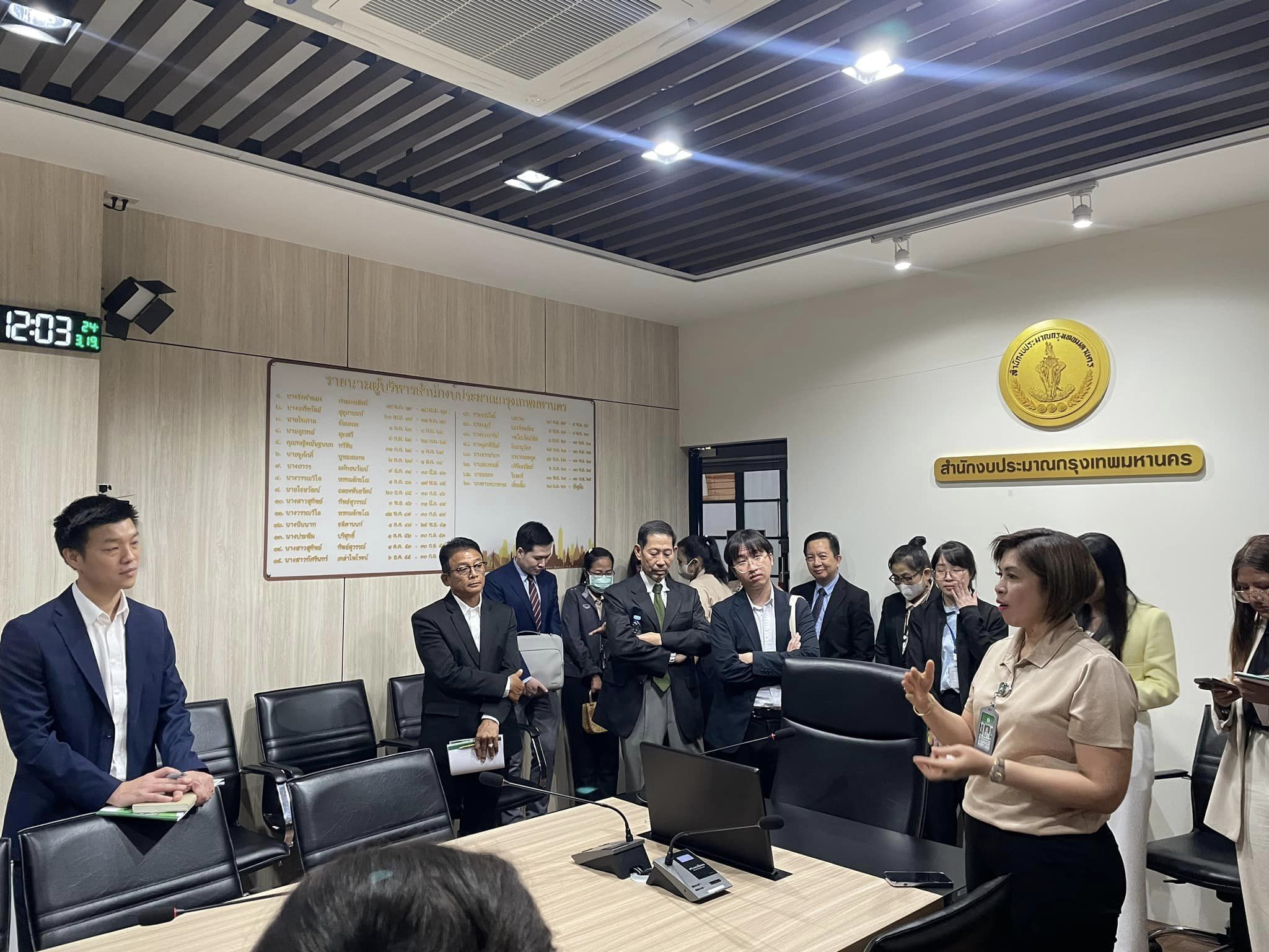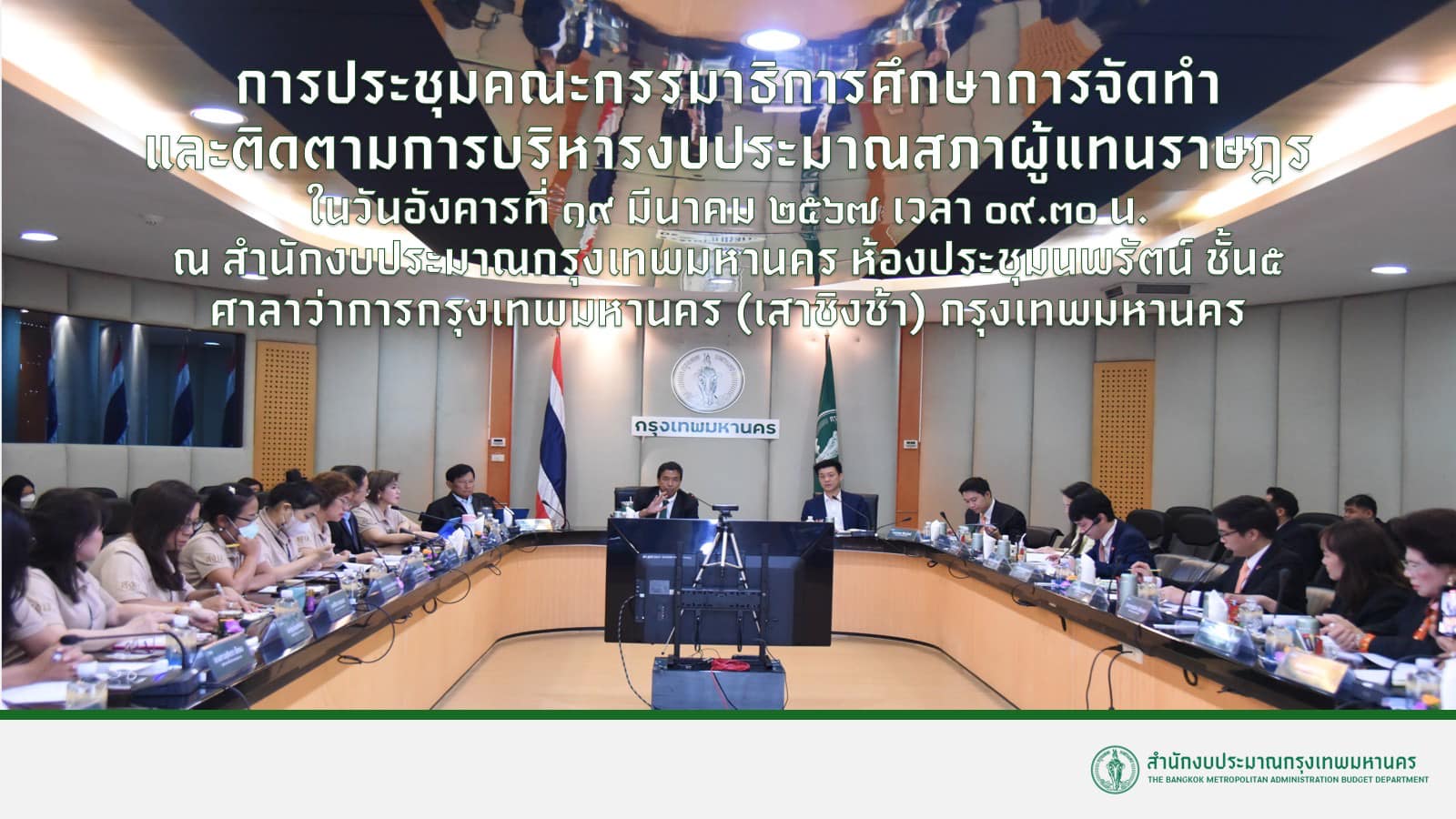 (19 มี.ค. 67) นายชัชชาติ สิทธิพันธ์ุ ผู้ว่าราชการกรุงเทพมหานคร เป็นประธานกล่าวต้อนรับคณะกรรมาธิการศึกษาการจัดทำและติดตามการบริหารงบประมาณสภาผู้แทนราษฎร พร้อมด้วยรองผู้ว่าราชการกรุงเทพมหานคร นายจักกพันธุ์ ผิวงาม และ รศ.ดร. ทวิดา กมลเวชช ณ ห้องประชุมนพรัตน์ ชั้น 5 ศาลาว่าการกรุงเทพมหานคร (เสาชิงช้า) กรุงเทพมหานคร เวลา 09.30 น. นางสาวกนกวรรณ เอี่ยมลิ้ม ผู้อำนวยการสำนักงบประมาณกรุงเทพมหานครได้นำเสนอ .. กระบวนการจัดทำงบประมาณรายจ่ายประจำปีงบประมาณของกรุงเทพมหานคร ภาพรวมงบประมาณรายจ่ายประจำปีงบประมาณ พ.ศ. 2566 - 2567 และแนวทางการจัดทำงบประมาณรายจ่ายประจำปีงบประมาณ พ.ศ. 2568 รายละเอียดและความคืบหน้าการจัดทำงบประมาณแบบฐานศูนย์ (Zero - Based Budgeting) ในการจัดทำงบประมาณรายจ่ายประจำปีงบประมาณ ปัญหาและอุปสรรคการจัดทำงบประมาณรายจ่ายประจำปีงบประมาณพร้อมแนวทางการแก้ไข ในการนี้ นางสาวกนกวรรณ เอี่ยมลิ้ม ผู้อำนวยการสำนักงบประมาณกรุงเทพมหานคร พร้อมทั้งคณะผู้บริหารสำนักงบประมาณกรุงเทพมหานคร ได้นำคณะกรรมาธิการเยี่ยมชมการปฏิบัติภารกิจของสำนักงบประมาณกรุงเทพมหานคร